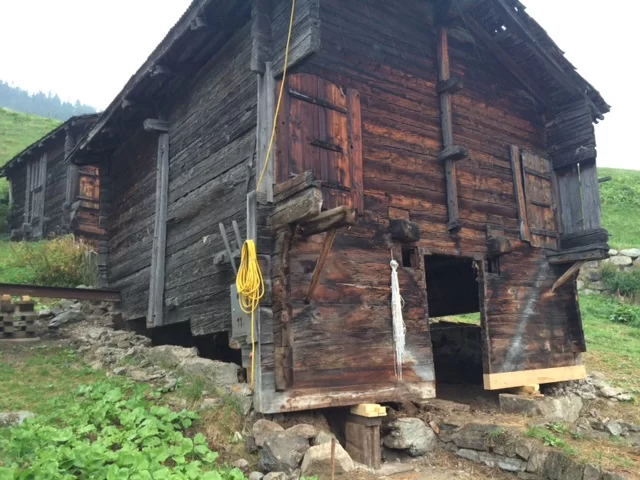 Nachdem diese Arbeiten erledigt wurden, erhielt der Stall ein neues Dach, damit anschliessend die Innenausbauarbeiten während dem Winter vollzogen werden konnten. Dabei wurde geschaut, dass das bestehende Altholz wie zum Beispiel jenes des Zwischenbodens wieder verwendet werden konnte, damit der Charakter des Stalles im schönen Goms beibehalten werden konnte.