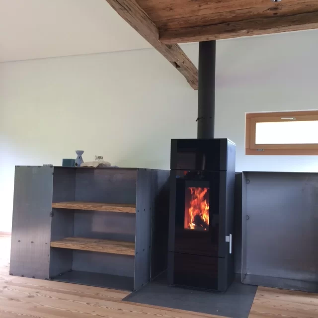 Die Innenwände wurden mit fermacell Gipsfaserplatten eingekleidet und anschliessend mit Gips versehen. Im weiteren wurde eine Bodenheizung verlegt, eine auf Mass angefertigte Küche am richtigen Standort eingebaut sowie ein Cheminéeofen als zukünftiger Blickfang im Wohnbereich platziert.