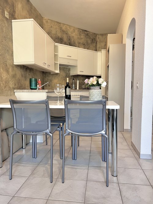 Die grosse und helle 2 ½-Zimmer-Parterrewohnung (ca. 50m2) besteht aus einem Gang mit praktischem Einbauschrank, Wohnraum mit zum Teil gedeckter grosser Aussenterrasse (40m2), einer geräumigen Wohnküche, einem grosszügigen und hellen Schlafzimmer mit Einbauschrank sowie sehr grossem Bad/WC. Die extra hohen Räume der Wohnung von 2,70m verleiht der Wohnung die nötige Eleganz. Direkt vom Schlafzimmer und dem Wohnraum gelangt man auf die riesige 40m2 grosse Terrasse, wo sich unter anderem ein echter „Tessiner Granittisch“ befindet.
